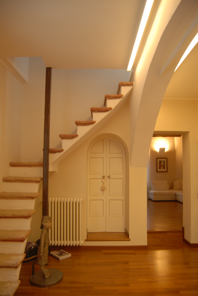 Ristrutturazione di un appartamento in centro storico che ha avuto come obiettivo quello di creare un ambiente accogliente, realizzando una scatola neutra da personalizzare nel tempo con oggetti e particolari. L'uso scenografico della luce, in sinergia con i dettagli architettonici di pregio, le scelte materiche ed i colori, creano un ambiente ricco di identità espressiva.